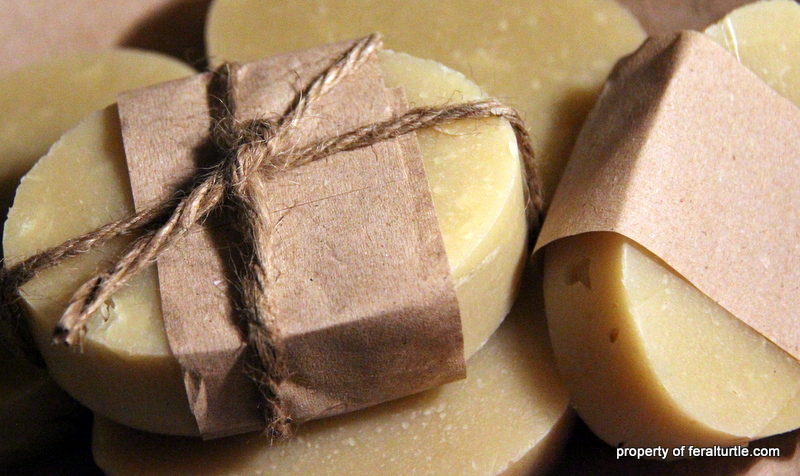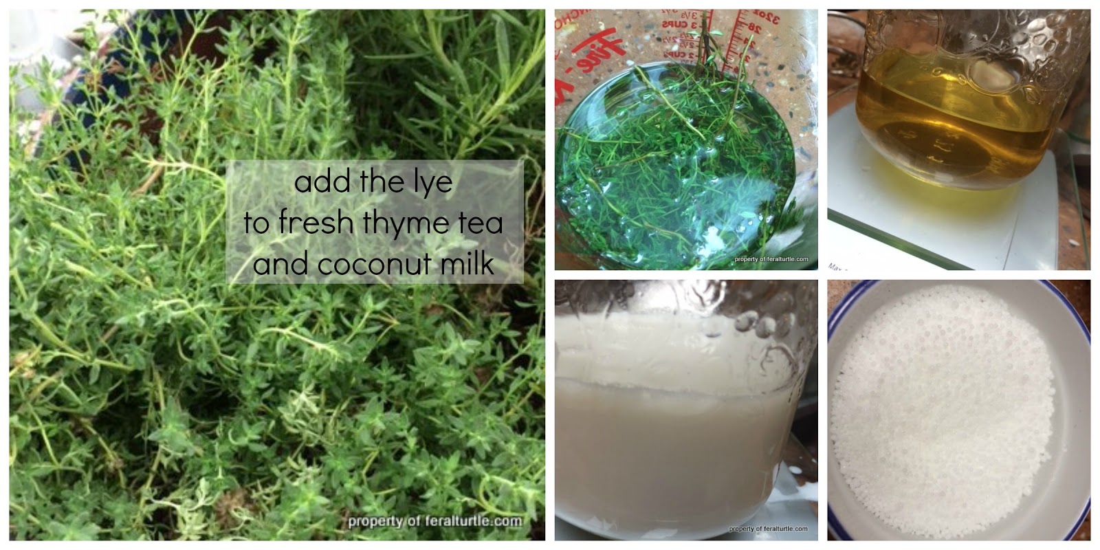 Meanwhile mix your thyme water with the coconut milk in a 1 litre glass canning jar. Place your jar in a sink and pour in the lye. Put cold water in the sink surrounding the glass jar. This helps cool the mixture more quickly. I use a wooden skewer to mix the lye water wearing my rubber gloves. Cool to 110 degrees. When both are at 110 degrees, pour lye mixture into oil mixture. Stir oil and liquid together with a silicone spatula or a wooden spoon. Now use your stick mixer and blend until the soap reaches trace. Poor in your essential oils and blend until thoroughly mixed. Pour your mixture into soap molds and wrap in a blanket. This needs to sit for a few days to a week, until it is fairly hard. Cut into bars and let air dry for a week on wire racks. This helps the air get to all the surfaces.